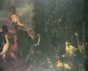 A Cockerel, A Hen, Chicks And An Owl In A Landscape