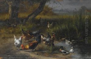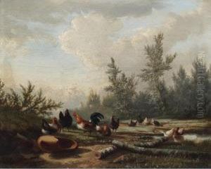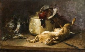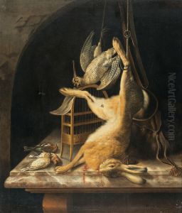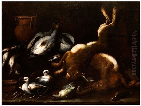 Stilleben Mit Einem Paar Erlegter Feldhasen Zwischen Geflugel Und Zwei Lebenden Tauben