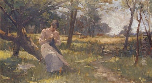 Young Girl Sewing Beneath A Tree