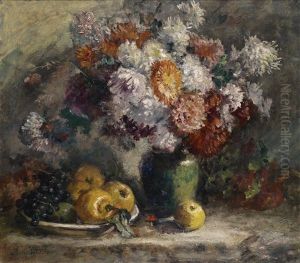 Stilleben Mit Trauben, Apfeln Und Birnen Auf Einer Buckelplatte. Dahinter Ein Blumenstraus Und Eine Korbflasche