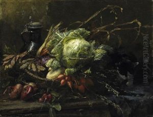 Groses Kuchenstilleben Mit Einem Korb Gemuse, Daneben Eine Katze