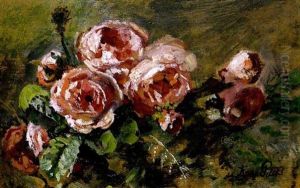 Blumenstillleben Mit Rosen Und Einem Weidenkorb Mit Himbeeren