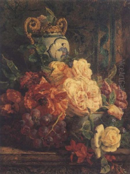 Still Life Of Roses, Grapes And An Urn, On A Ledge