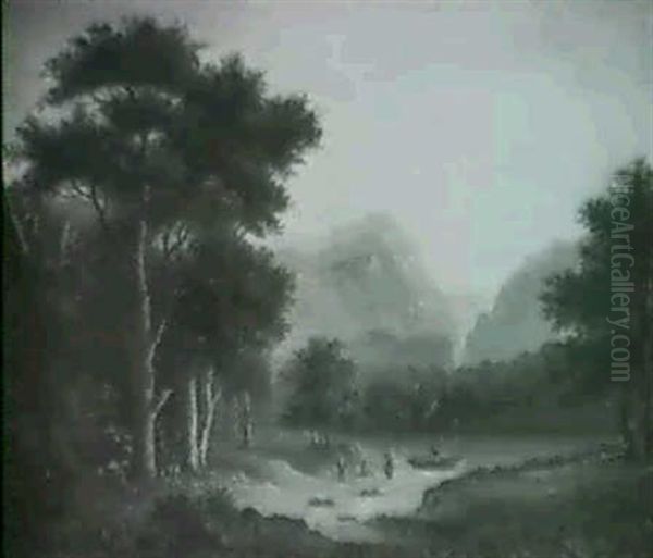Figures Resting By A Loch Below A Castle, A Mountainous Landscape Beyond; Figures By A Loch...(a Pair)