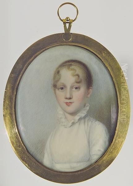 A Young Lady, Wearing White Dress With Standing Frilled Collar, Her Blonde Hair Drawn Back With Curls Falling Across Her Forehead.