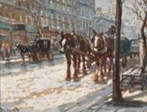 A Winter's Evening, London Street Scene With Figures, Horse Drawn Carriages And Omnibus