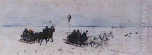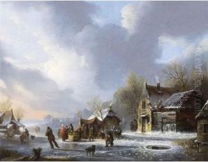 A Winter Scene With Figures Skating And Sledging On A Frozen River