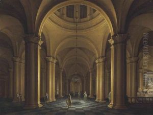 Elegant Women And Other Townsfolk In The Aisle Of A Gothic Church At Night