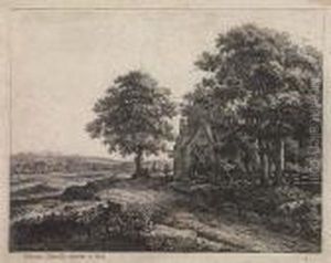 A Wooded Landscape With A Herdsman Watering Cattle And Travellers On A Track Beyond