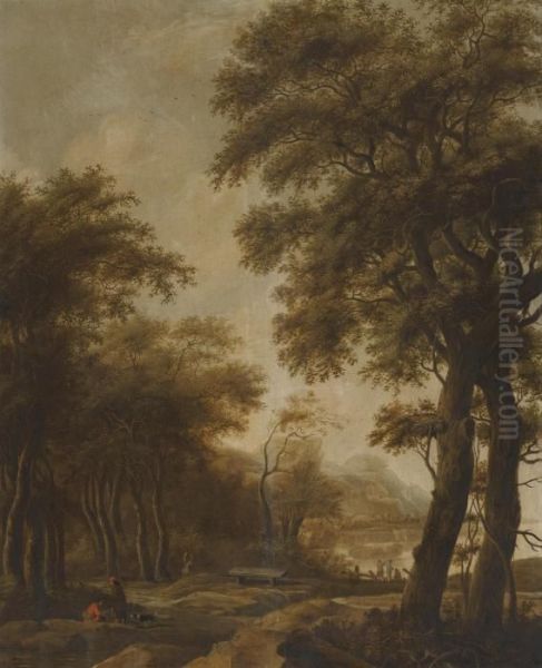 Figures In A Wooded River Landscape