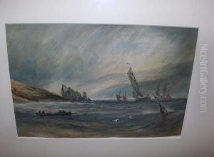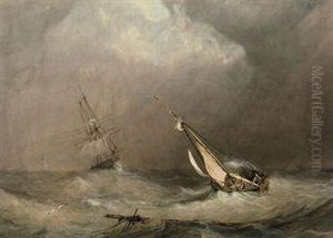 Figures In A Row Boat In Choppy Seas, A Sailing Vessel In Distress In Background, Town On The Shore In The Distance