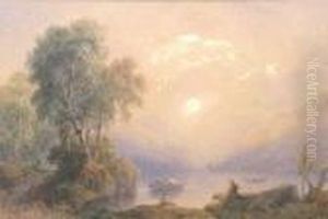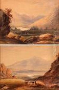 Two Figures In A Landscape, Overlooking A River With A Town Andmountains Beyond