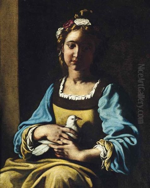 Portrait Of A Girl, Half-length, In A Green Dress With Blue Sleeves And A Garland Of Flowers In Her Hair, Holding A Dove In Her Lap