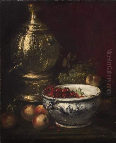 Natura Morta Di Frutta, Fragole In Una Coppa Di Porcellana Ed Elaborato Vaso Metallico Su Di Un Piano