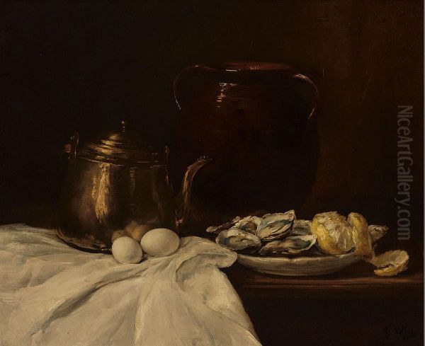 Stilleven met koperen kan, eieren en schaal met oesters