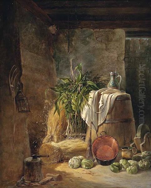 Erntestillleben Mit Kohlkopfen, Kupferschussel, Korngarben Und Einem Grosen Fass.
