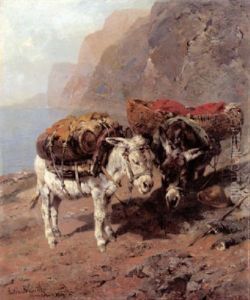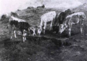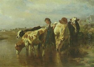 Hutejunge Zu Pferd, Der Seine Kuh Am Brunnen Trankt