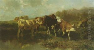 Jungvieh An Der Tranke Im Mittagssonnenlicht