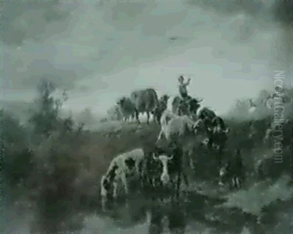 Huterbub Mit Rinderherde An Der Tranke Vorn.
