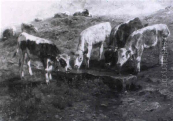 Jungvieh An Der Tranke Vorn