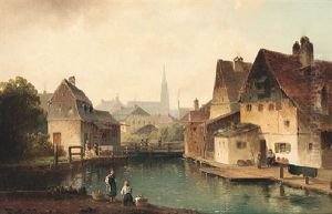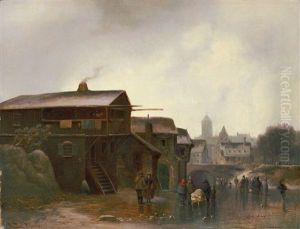 Folkeliv Pa En Tilfrossen Flod I En Landsby, I Baggrunden Alperne