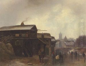 Winterlandschaft Mit Bauern Vor Einer Hutte Bei Einem Feuer Am Wasser