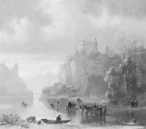 Winterlandschaft Mit Eislaufern Auf Zugefrorenem Fluss