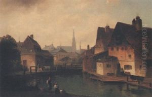 Figurer Pa Fruset Vattendrag Intill Byggnader