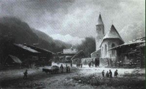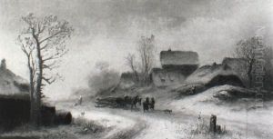 Dorfstrasse Im Winter Mit Staffagefiguren Vorn, In Der Ferne Der Kirchturm