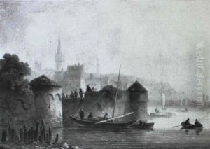 Numerous Figures On A Lake Shore With A View Of A Monastery Beyond