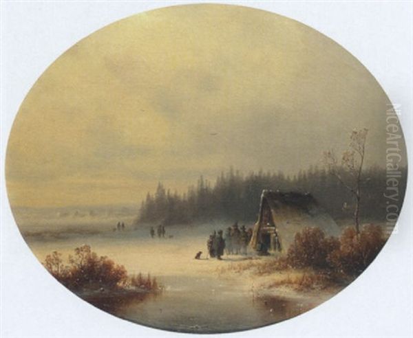 Winterlandschaft Mit Bauern Vor Einer Hutte Bei Einem Feuer Am Wasser
