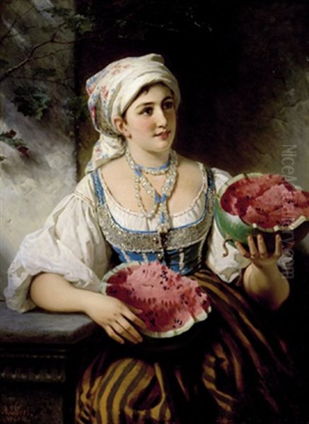 Bring the timeless beauty of Anton Ebert's Die Melonenverkauferin into your home with a handmade oil painting reproduction. Carefully recreated on canvas by skilled artists using traditional techniques, this piece captures the delicate brushwork, subtle light, and vibrant color of the original masterpiece. With museum-level quality and rich texture, it brings elegance and artistic depth to any space. Enjoy free shipping and make this masterpiece a part of your personal collection.