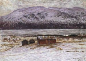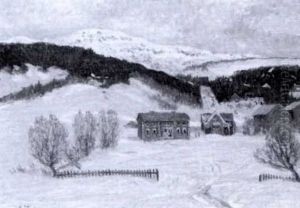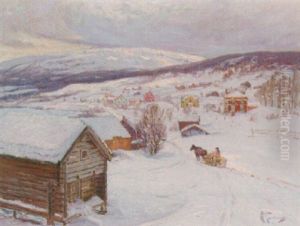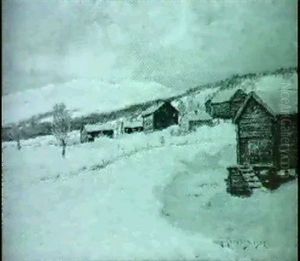 Vinterlandskab, I Baggrunden Huse Og Bjerge