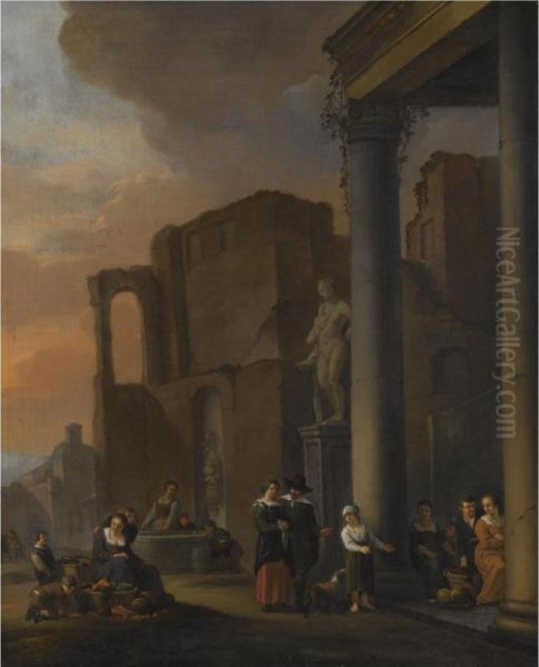 A Capriccio Scene With Classical Ruins And Figures Selling Fruit And Vegetables In The Foreground
