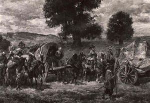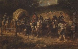Ziehende Landsknechte Mit Planwagen Auf Der Landstrase