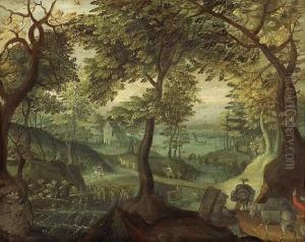 An Imaginary Landscape With Figures Anddonkeys In The Foreground
