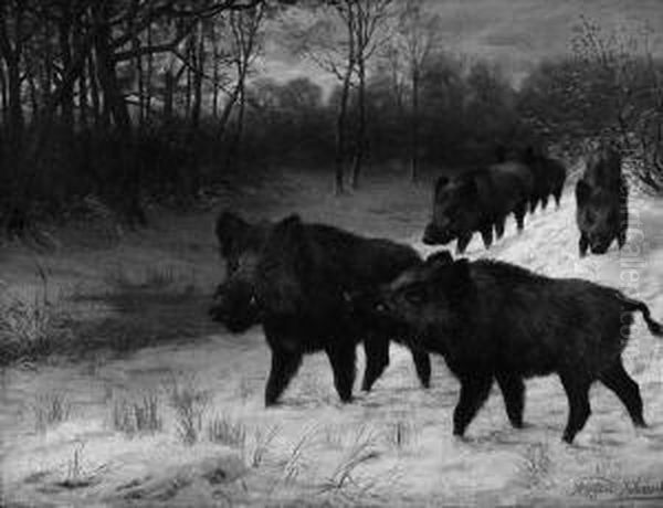 "wildschweinrotte Im Schnee". Sign. Und Dat. 82. Ol Auf Lwd. Doubliert. 52 X 68 Cm. Rahmen