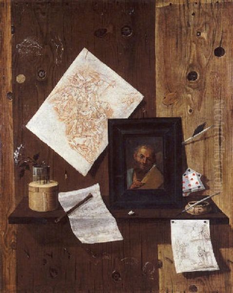 Nature Morte De Trompe-l'oeil Aux Dessins, Tableaux Et Cartes A Jouer Sur Un Panneau