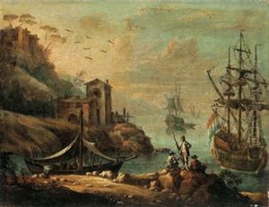 A River Landscape With Fishermen And Peasants With Cattle On An Embankment, A Harbour And A Fortified Town On A Hill Beyond