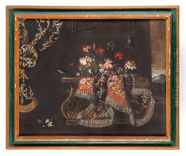Natura Morta Con Tavola, Tessuti Ricamati E Fiori