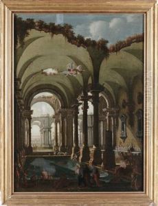 Architectural Capriccio With Figures Among Classical Ruins By An Inlet (+ Architectural Caprccio With Figures Under A Ruined Colonnade; Pair)