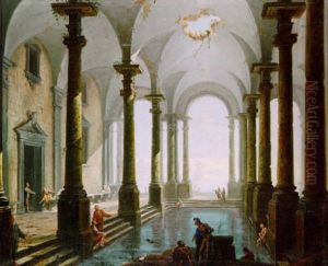 An Architectural Capriccio With Figures Beside A Fountain Before A Ruined Arch, An Amphitheatre In The Distance