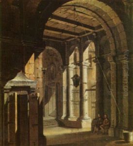 The Interior Of A Classical Building, With Soldiers Guarding The Entrance At The Base Of Steps