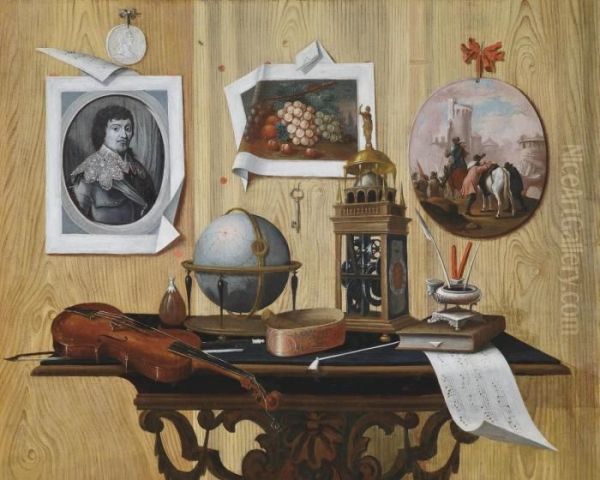 A Trompe L'oeil Of A Print And Two Paintings, A Key, A Violin, A Globe, A Clock, A Sheet Of Music And Other Objects On A Table