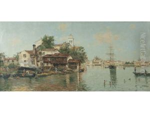 A Venetian Canal Oil Painting by Antonio Maria de Reyna Manescau