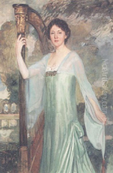 Portrait Of A Lady Wearing A Blue Gown And Standing Before A Harp