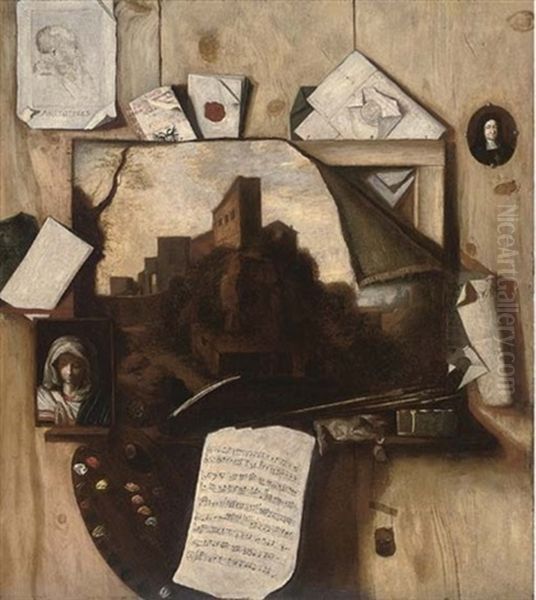 A Trompe L'oeil Of Paintings, A Drawing, An Artist's Palette, Letters And A Sheet Of Music