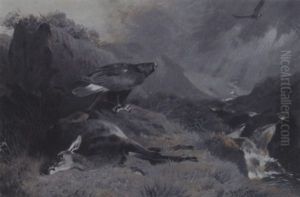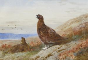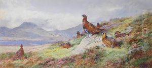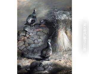 A Covey Of Nine Red Grouse Bathing In The Sun, A Storm Brewing