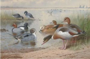 Mallard, Tufted Duck And A Kingfisher At The Water's Edge