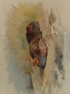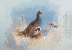 Partridges In A Meadow With A Farm Beyond
